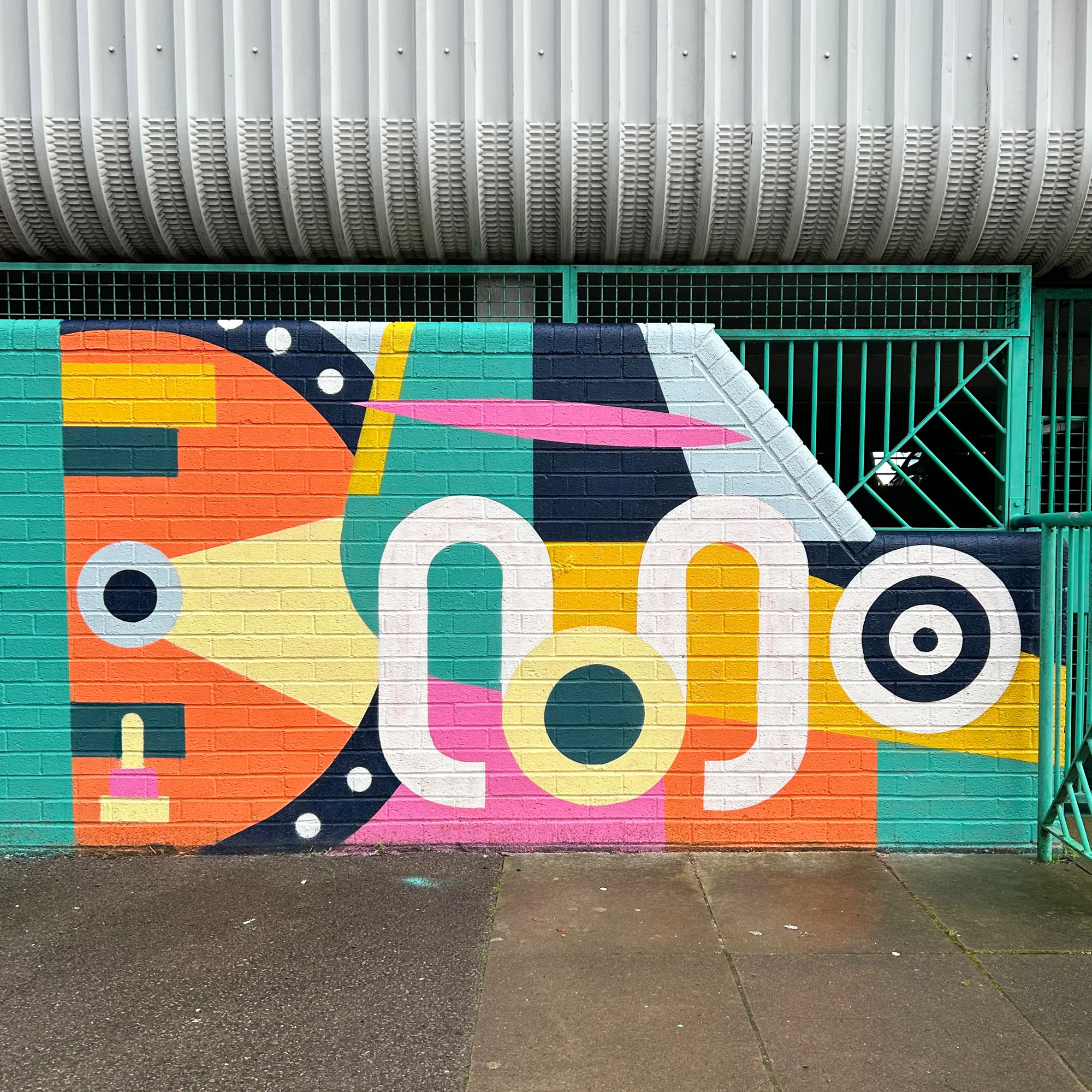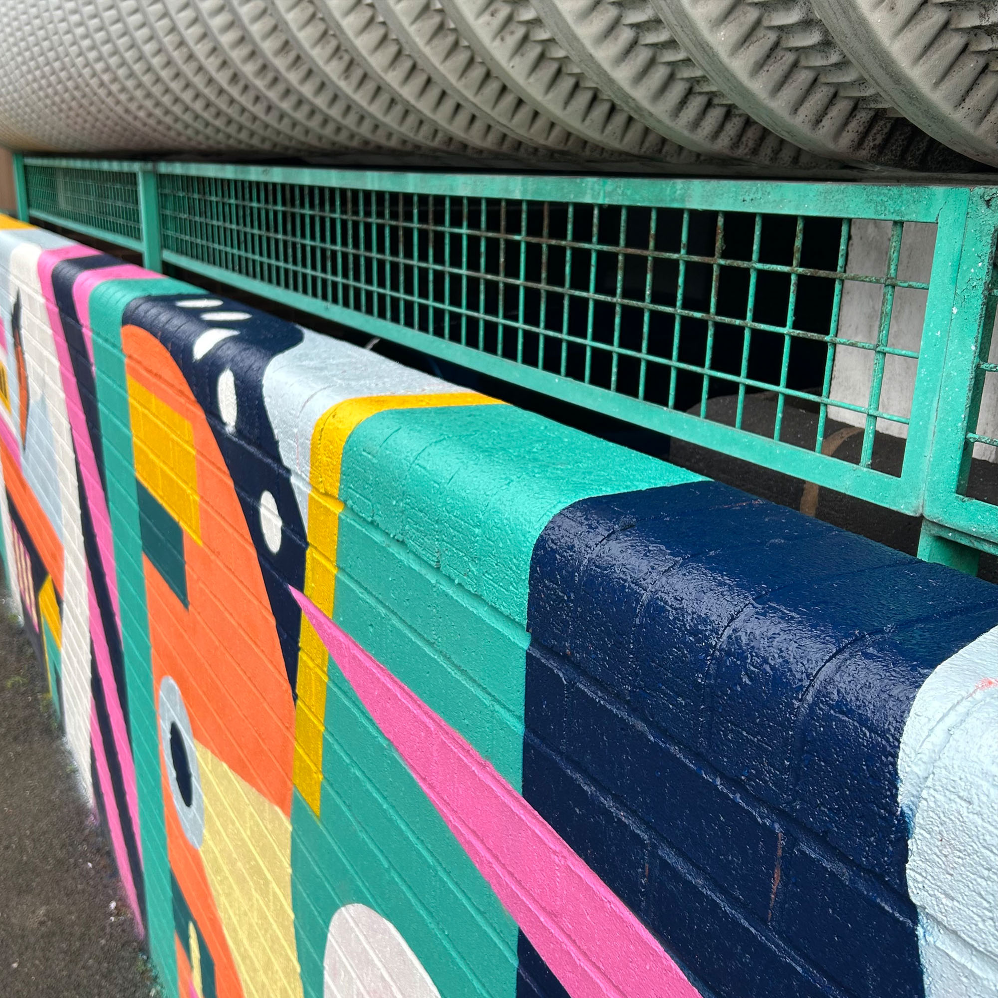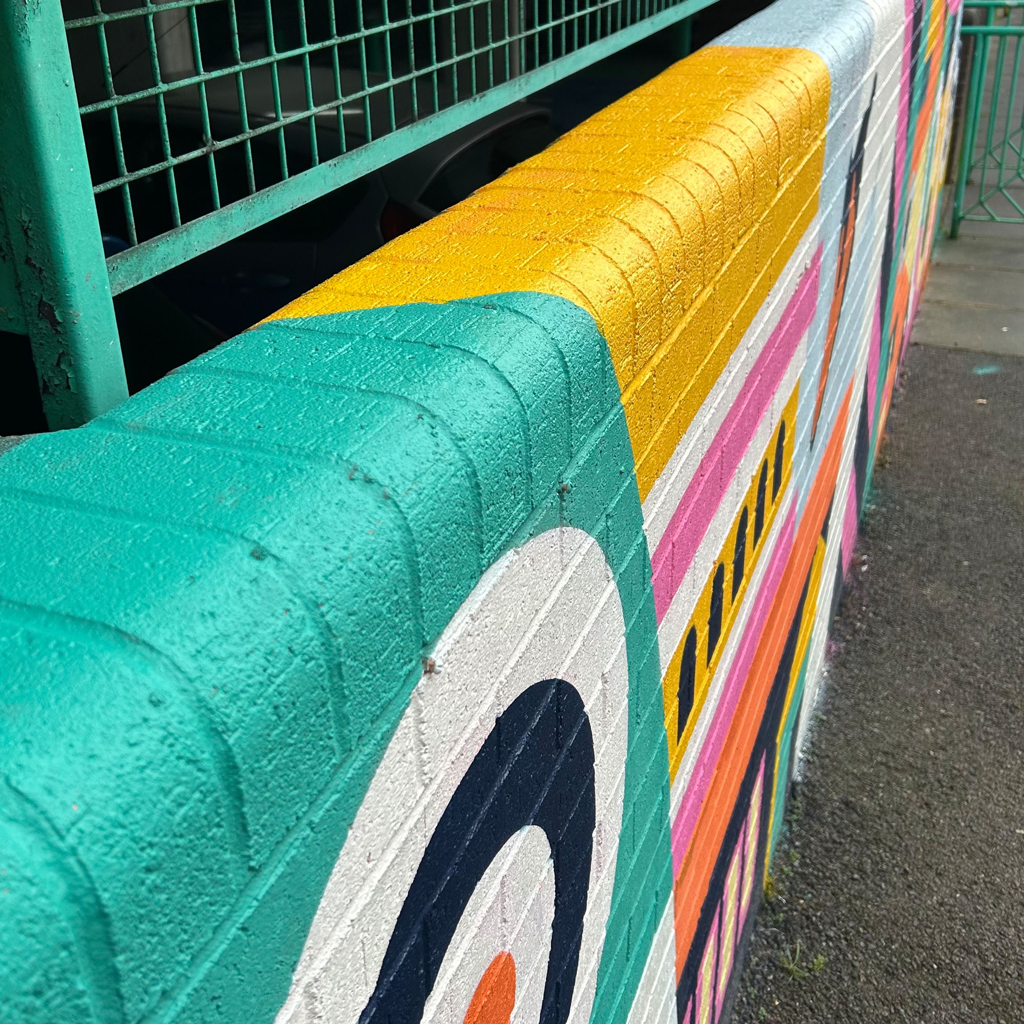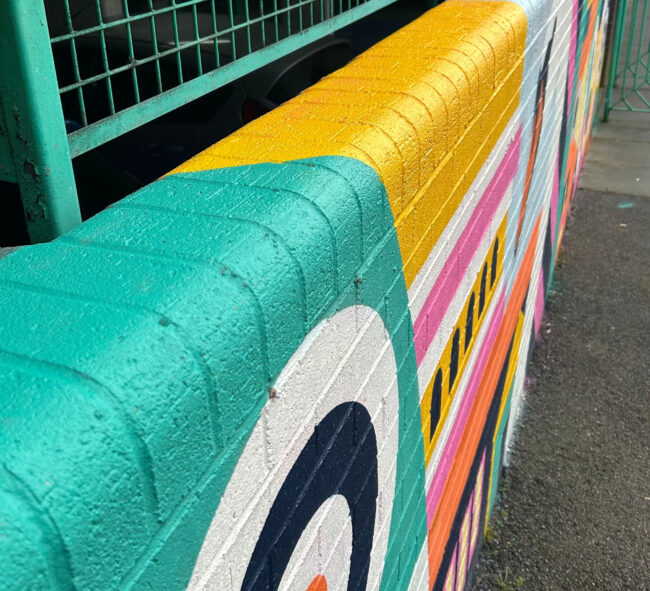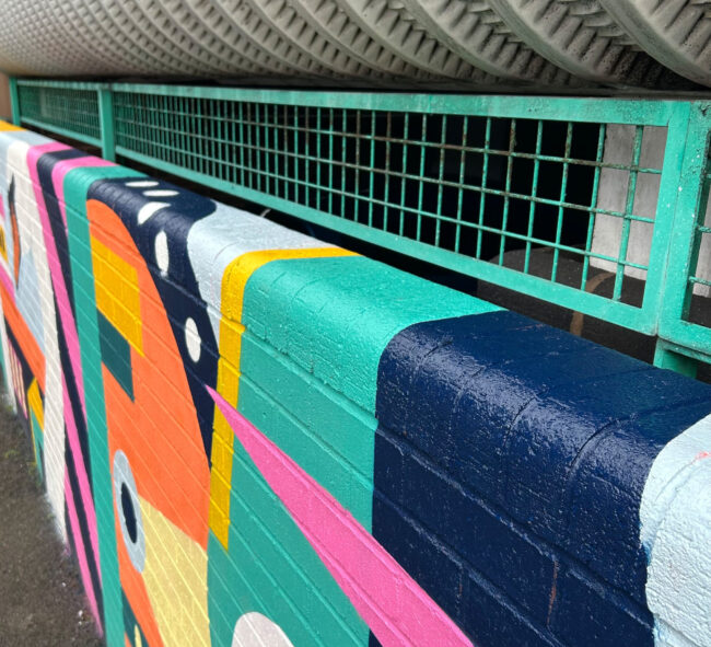 The mural playfully engages with the surrounding architecture, incorporating existing features of the site to strengthen the overall composition.